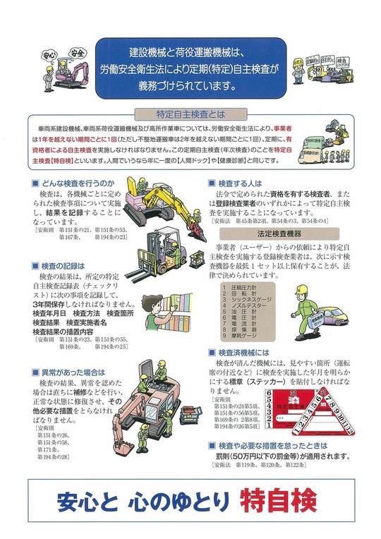 特定自主検査の実施は、機械の機械不良や損傷などの異常を早期発見し、異常の個所を補修することによって、故障などによる労働災害を未然に防止し、作業者の安全確保と機械の性能保持を図ることにあります。
