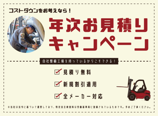 「今の検査料は適正かな?」「初めてなんだけどどこの業者でやっていいかわからない」そんなお客様は、年次点検(特定自主検査/定期自主検査)のお見積りキャンペーン(無料)をお試し下さい。