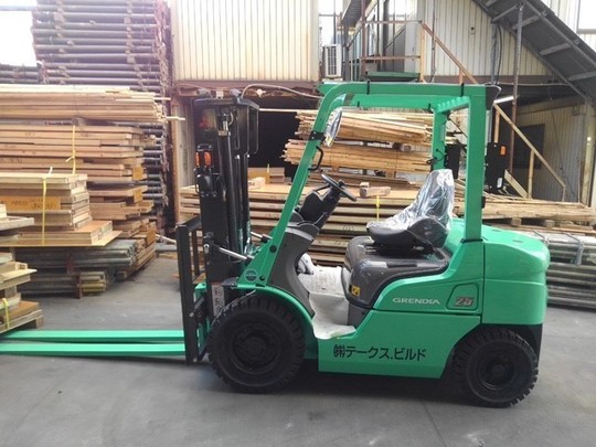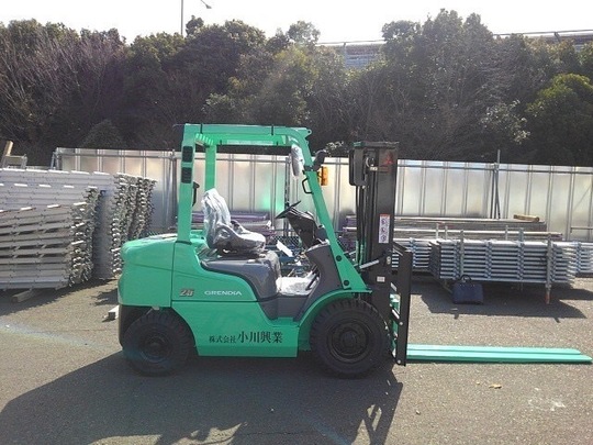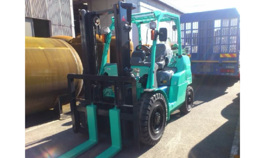 2.5トンの三菱製ガソリンフォークリフトです。足場屋さんなので、フォーク(爪)の長さが長めの1820mm(特注)が必要なのと、レンタルフォークリフトの在庫に「サイドシフト」がありませんでした。そこで営業スタッフが新車をご提案させて頂いたところ、購入を決めて下さいました。