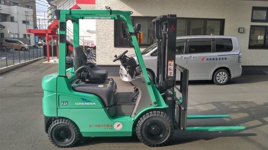1.5トンの三菱製ガソリンフォークリフトです。こちらのお客様は隣が住宅地なので、バックブザーにON/OFFスイッチをご利用になられています。深夜のときは近隣のことを考えてOFFにされているそうです。メンテリース契約で法定費用も込みのお値段となっています。