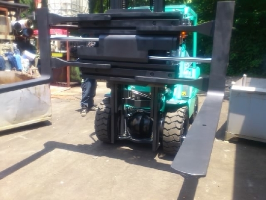 三菱製グリンディアです。4.5tでサイドシフト・フォーククランプ・ハイマストがついています。クランプはパレットなしで爪で直接左右から荷物を挟む事ができます。爪が縦に平らなベールクランプと違い爪をそのまま使う事もできます。