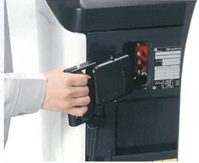 2.5tです。高マストで4.3メーターがついています。お客様より「高いところのピッキング作業もしたい!」とのご要望を頂き、人も一緒に上昇してピッキング作業でき、トラックからの荷物を取れるような仕様にさせて頂きました。簡易型リフトリモコンがついており、運転席側で操作しなくても、パレットに乗っている人が操作できるようになっています。キーを回して電源をONにして、UPで上昇、DOWNで下降します。