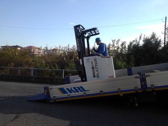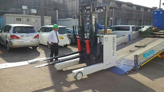 1.2tです。フォークリフトの爪やタイヤに、お酒をかけて安全を祈願しました。お客様は「ぶつけて汚してはいけない、という安全意識が向上するのでいいですね!やっぱりリーチと言えば、ニチユのプラッターですね!」とおっしゃっていました。