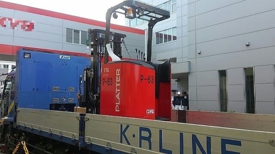 1.5tです。標準色は白なのですが、オプション塗装の赤となっています。色鮮やかで、なかなか良い感じです。納車日はあいにくのお天気となってしまいましたが、リーチフォークリフトが雨に濡れないよう、毎回丁寧にビニールをかぶせて運搬させて頂いております。