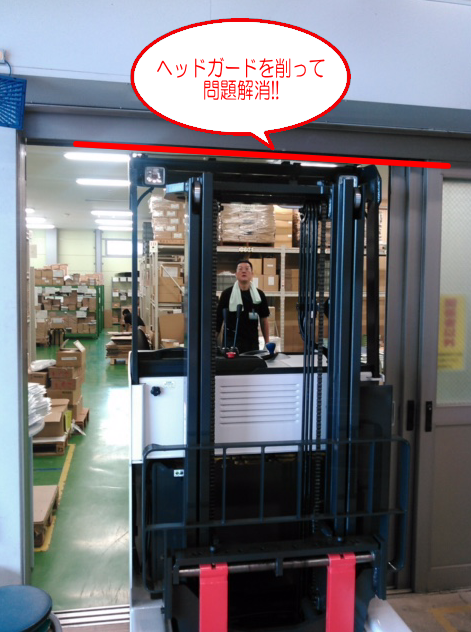 1tです。出入口のドアが大変低く1m97cmしかありません。通常のヘッドガード(フォークリフトの屋根の部分)の高さ(2m22cm)が入れないので、ヘッドガードまでの高さを50cmカットするという特注品をご提案させて頂きました。また2階に荷物を持ち上げるそうなのですが、最大荷重(持ち上げられる最大の重さ)が決まっているそうです。毎回「はかり」に乗せて確認するのは大変だと思い、簡易荷重計をご提案させて頂きました。