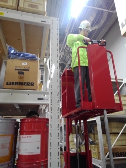 1tピッカーです。写真のように安全帯をしっかり装着するようになていますので、落下する心配がなく、安心して作業ができます。4.5mある棚の荷物も1人で簡単に取ることができますので作業効率が大変良くなります。