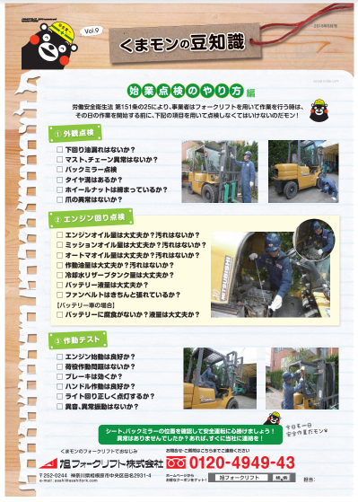 職場で毎朝フォークリフト乗車前に、必ず下記の準備内容を確認しているでしょうか?このページを印刷して、徹底していれば○ 徹底していない場合は×を記入してみて下さい。