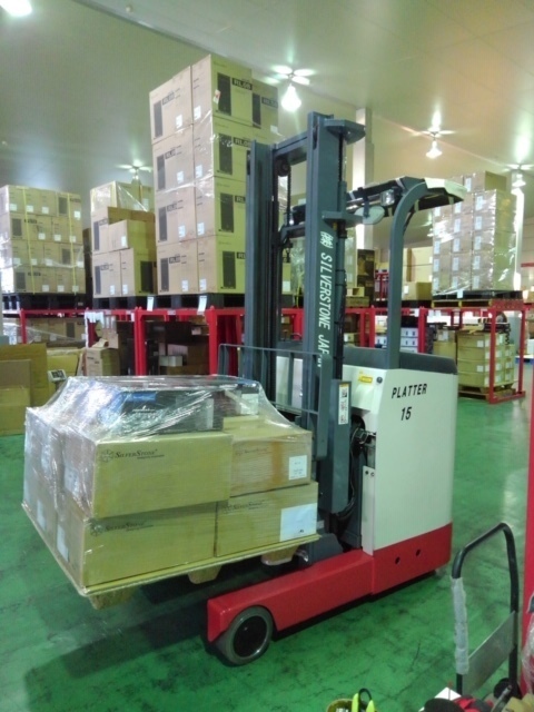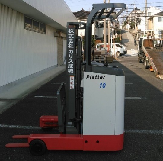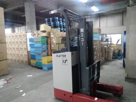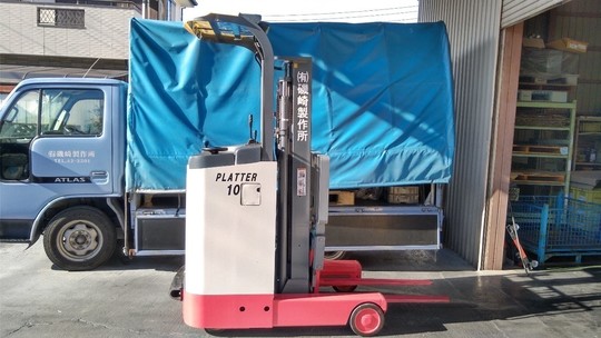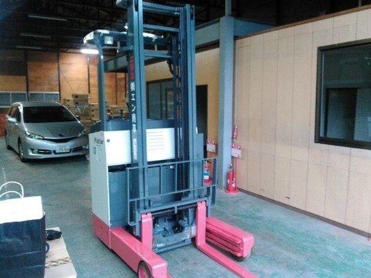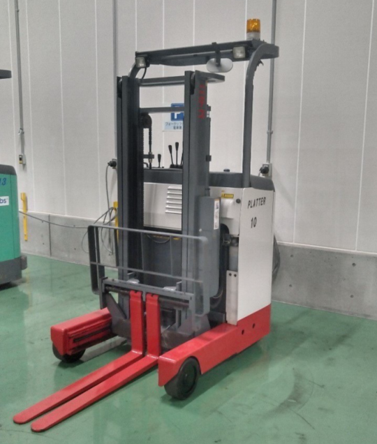 1トンのリーチフォークリフトです。カウンターフォーク(座って乗るタイプ)をお使いでしたが、倉庫内で使うので排気ガスを出さず倉庫内で小回りの効く、リーチ式(立って乗る)バッテリーフォークリフトをオススメしました。倉庫用の棚「ネステナー」も30個納品させて頂きました。