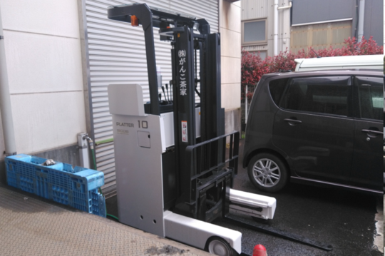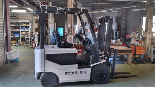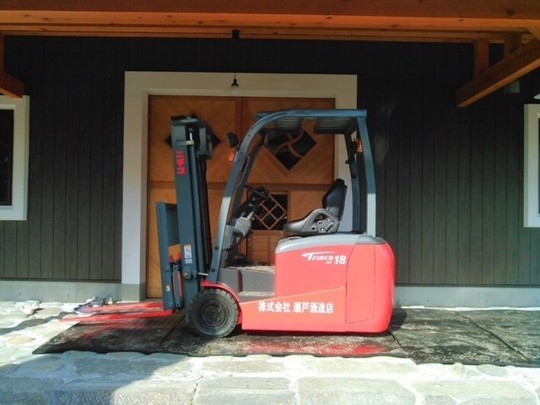 1.8トンのバッテリーフォークリフトです。蔵の中でお使いになるので、排ガスの出ないバッテリーフォークリフトの三輪式「トリンカ」を選ばれました。小回りを効かせるため後輪が2本くっついていて、狭い通路や倉庫内でも、くるっと自由自在に方向転換する事ができます。爪の幅が動いて大きさの違うものをつかめる「サイドシフト」を付きです。