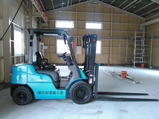 2.5トン三菱製ガソリンフォークリフトです。足場屋さんなので長爪1520mmがついています。お使いのフォークリフトが古くなったので代替で中古車を新たに購入して下さいました。使用中にエラーコードがでましたが、整備士がすぐに対応させて頂きました。