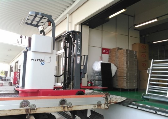 1トンのリーチフォークリフトです。敷地面と比べて倉庫の床面が高い倉庫「プラットフォーム」はホコリが入りにくく、湿気の影響をうけにくいため、付加価値の高い商品に適しています。倉庫の床面が高い場合でもフォークリフトが使用しやすいよう、お客様の作業環境に合わせた車両をご提案させて頂きました。