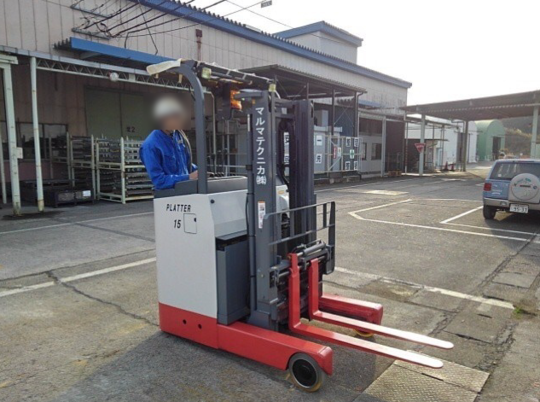 1.5トンのガソリンフォークリフトです。お持ちの中古車の修理代がかさんできてしまい、年次点検(車でいう車検)が切れる前に中古フォークリフトへ代替をされました。少しでも経費削減ができる様、整備士と営業マンで連携してお客様へアドバイスさせて頂いております。その場ですぐ使って下さり「問題ないね」と嬉しそうでした。