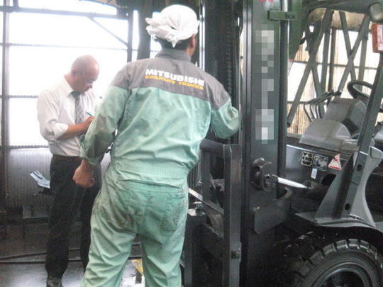 営業マンと整備士が2人ペアになってフォークリフトの不具合がないかどうかを、納車前チェックシートに毎回記入します。30項目以上にわたる点検をしっかりと行ってからトラックに乗せて運搬させて頂きます。