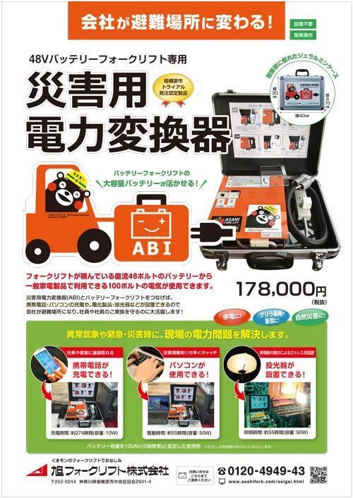 災害時バッテリーフォークリフトから電源をとり、様々な用途に使える便利な電力変換器です。