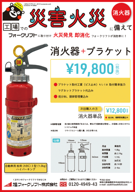 フォークリフトに取り付けすることで、工場での火災発生時に、即時消火作業が可能です。