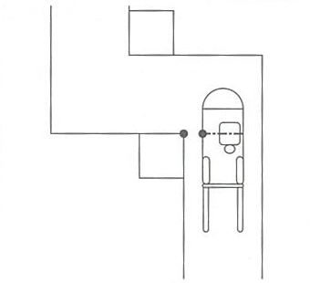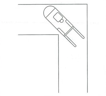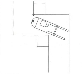 2.曲がるコーナー1メートル手前で、曲がる方向の角を見て、シート中央部が角と一致したらハンドルをすばやく約1回転半切ります。