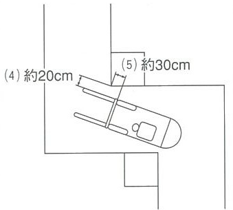 5.前輪タイヤと角が約30cmあいていればすばやく右側後方を見る。カウンタウエイト中央部分が通路中央線と一致したらすばやくハンドルを戻します。