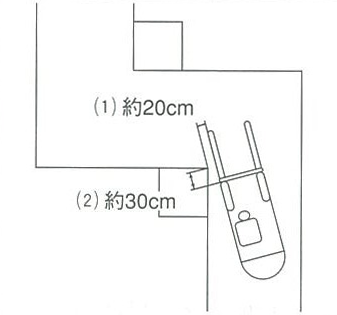 2.バックレストが曲る方向の角に対し約30cm手前に来たらハンドルを約1回転半切ります。
