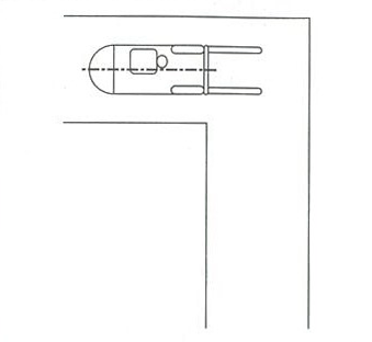 6.通路中央部分とフォークリフト中央部が合ったらすばやくハンドルを戻します。
