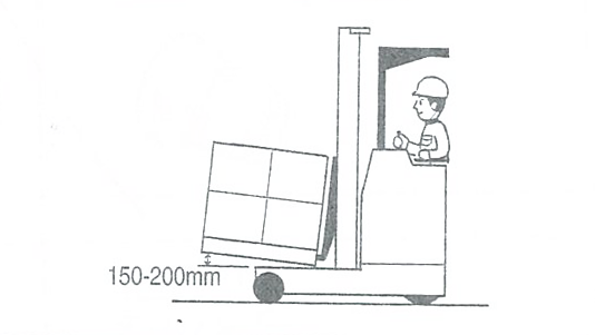 パレットをストラドルレッグ上面より15~20cm程度の高さまで静かに下げ、フォークを積荷の状況に応じて荷が安定する位置の最大までティルト(後傾)します。