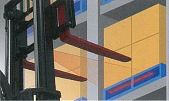 フォークをパレットまたはスキッドの位置まで上げたあと、レーザー光がパレットのケタ中心部に照射するようにフォークを停止させます。