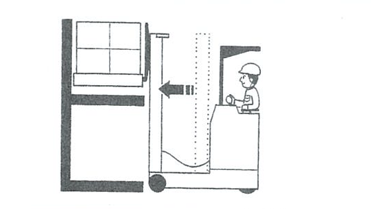 リーチ操作により、フォークをパレットまたは荷物に引っ掛けないよう注意しながらマストを手前いっぱいまで繰り込みます。