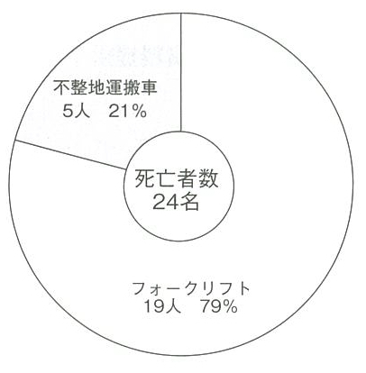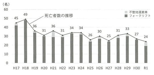 令和元年の死亡者数は24名であり、平成17年の45名と比べると、21名の減(47%)でした。これはフォークリフト発生件数の減によるものであり、ここ数年1〜3件の発生であった不整地運搬車は、5件の発生となり、平成21年(7件)以来の高い数値となりました。