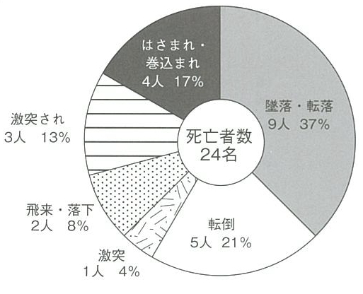 | 墜落・転落 | 転倒 | 激突 | 飛来・落下 | 崩壊・倒壊 | 激突され | 挟まれ・巻き込まれ | その他 | 計 | |