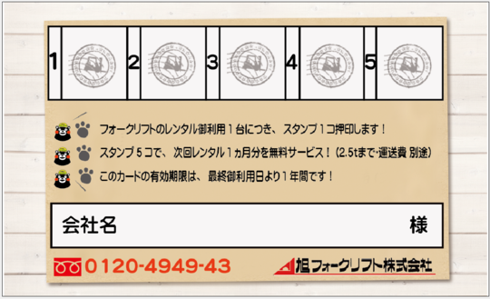 スタンプを5つ集めると、次回のフォークリフトレンタルの際に、なんとフォークリフトレンタル1ヶ月料金が無料になります!!