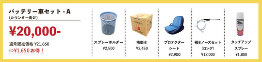 バッテリーフォークリフト(カウンター向け・座って乗るタイプ)を購入したお客様向けのお得な作業効率アップ商品のセットです。 5アイテムの通常販売価格21,650円が、セット購入で1,650円もお得になります。 タッチアップスプレー約0.5本分もお得です。