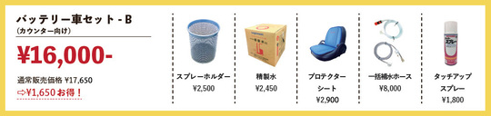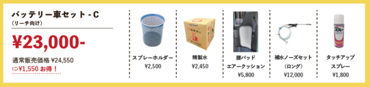 バッテリーフォークリフト(カウンター向け・座って乗るタイプ)を購入したお客様向けのお得な作業効率アップ商品のセットです。 5アイテムの通常販売価格24,550円が、セット購入で1,550円もお得になります。 タッチアップスプレー約1本分もお得です。