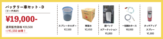 バッテリーフォークリフト(リーチ向け・座って乗るタイプ)を購入したお客様向けのお得な作業効率アップ商品のセットです。 5アイテムの通常販売価格20,500円が、セット購入で1,550円もお得になります。 タッチアップスプレー約1本分もお得です。
