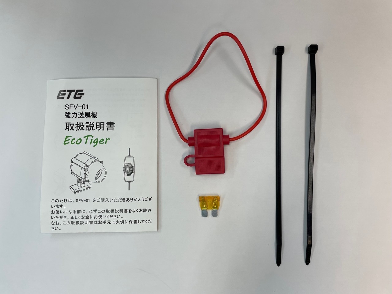ファン電源はケーブルに接続します。付属のヒューズを介して電源DC12Vに接続します。